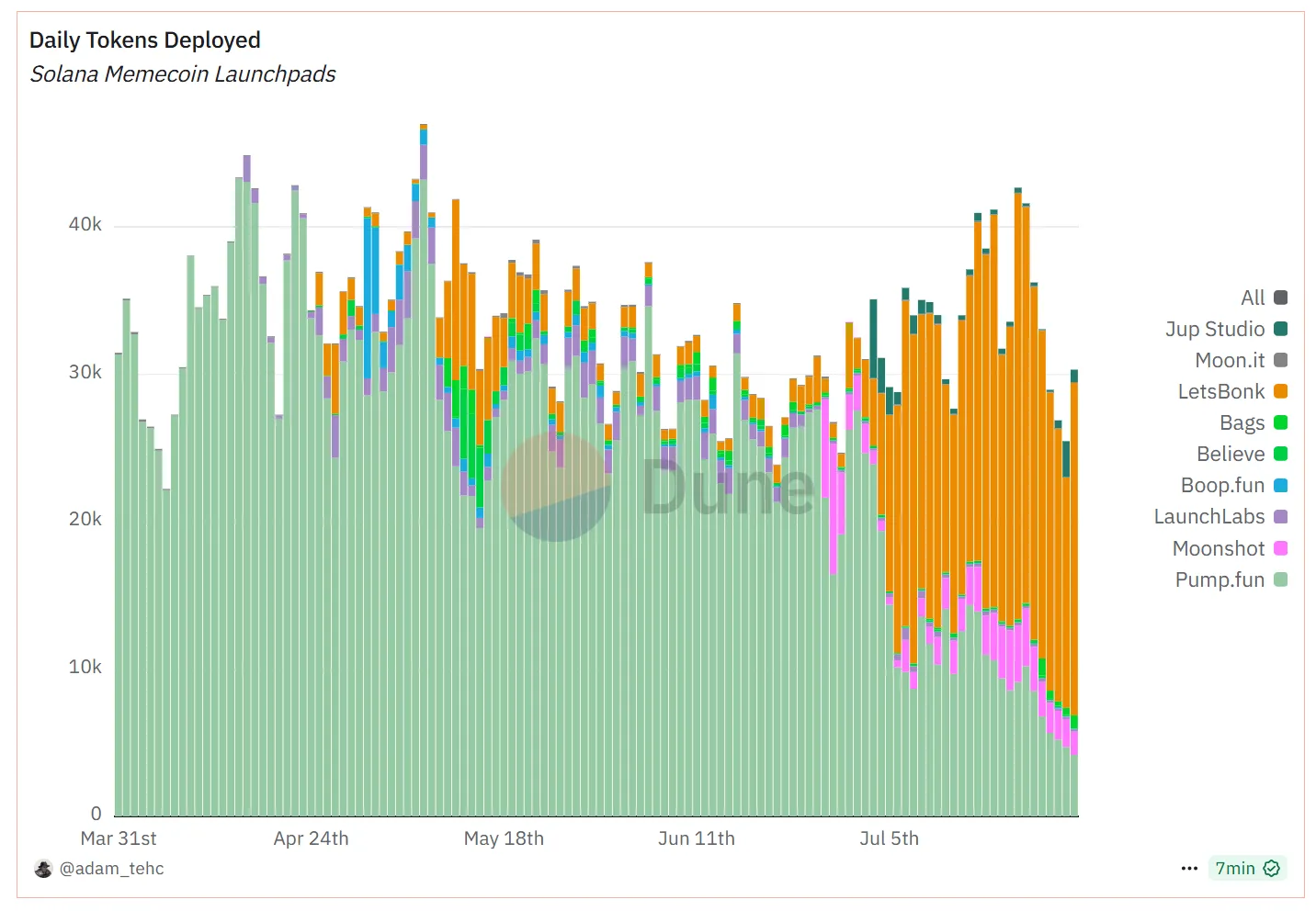 July has seen a turning point in customer behavior, with LetsBonk overtaking Pump.fun in token launches. Photo: Dune / @adam_tehc